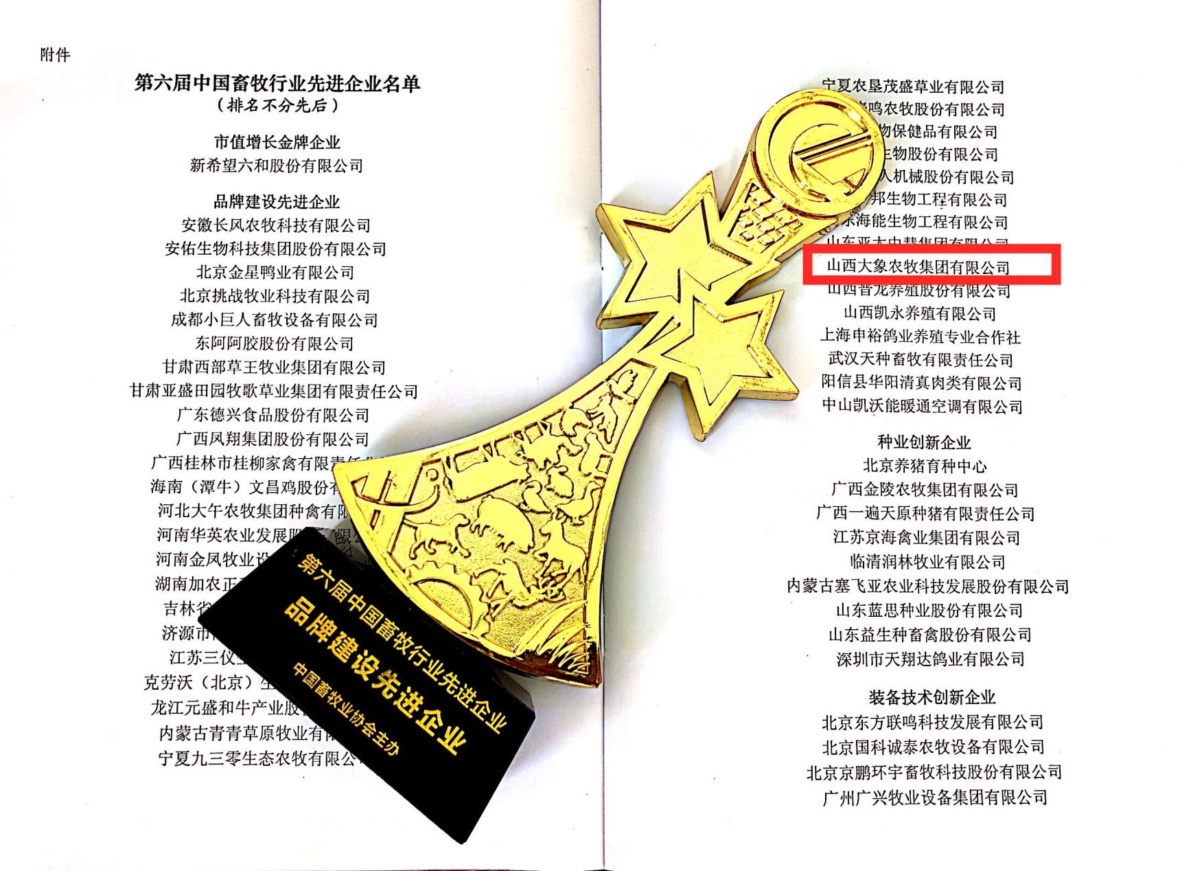 山西大象农牧集团有限公司作为行业领先的国家级农业产业化重点龙头企业,运用独特的自养+代养模式支撑公司迅速扩张产能,其成熟、可靠及高效的养殖技术和口碑良好的产品品牌受到中国畜牧业协会的高度认可,被授予“第六届中国畜牧行业先进企业品牌建设先进企业”。